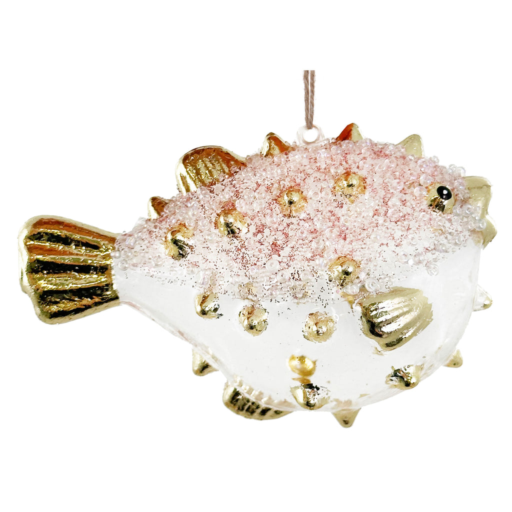 This delightful Pufferfish shines with sparkling pale hues, glittering jewels, and gold shimmering scales. It measures a graceful 11cm.