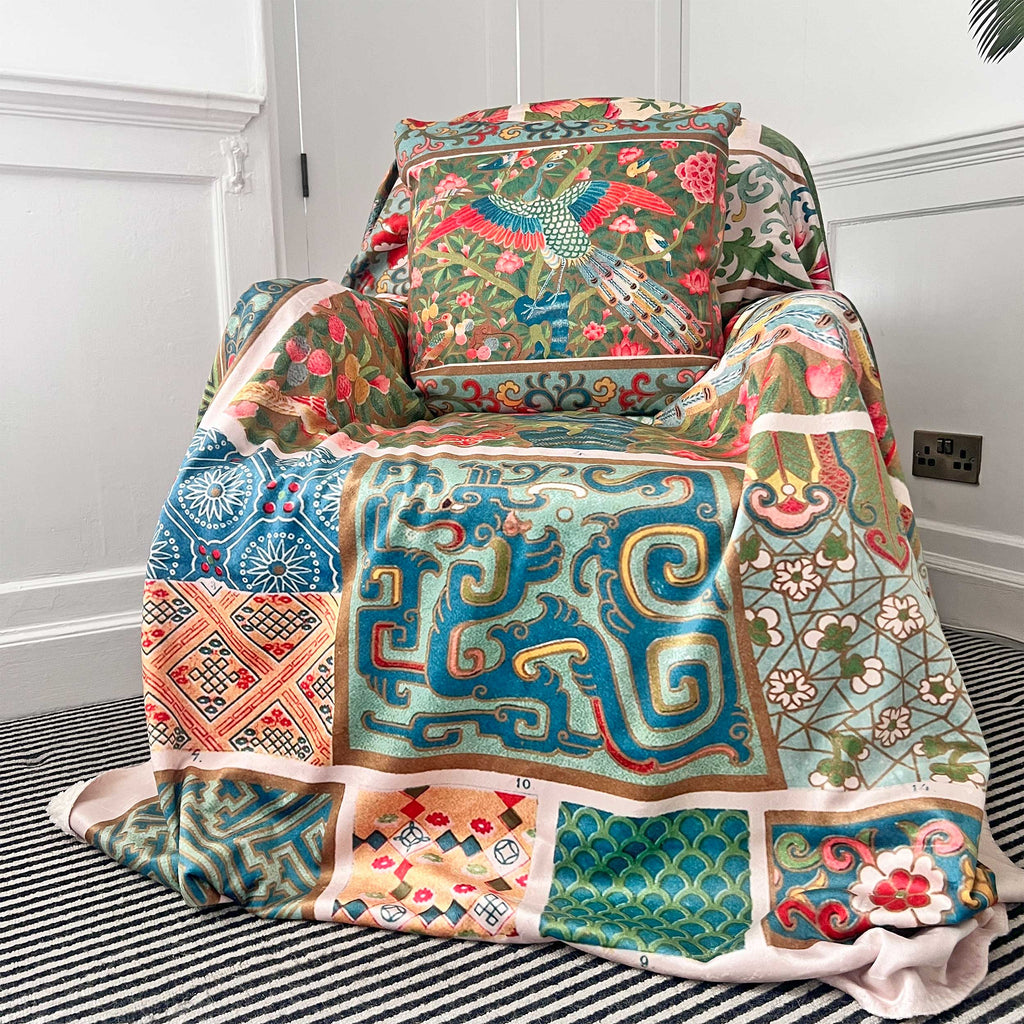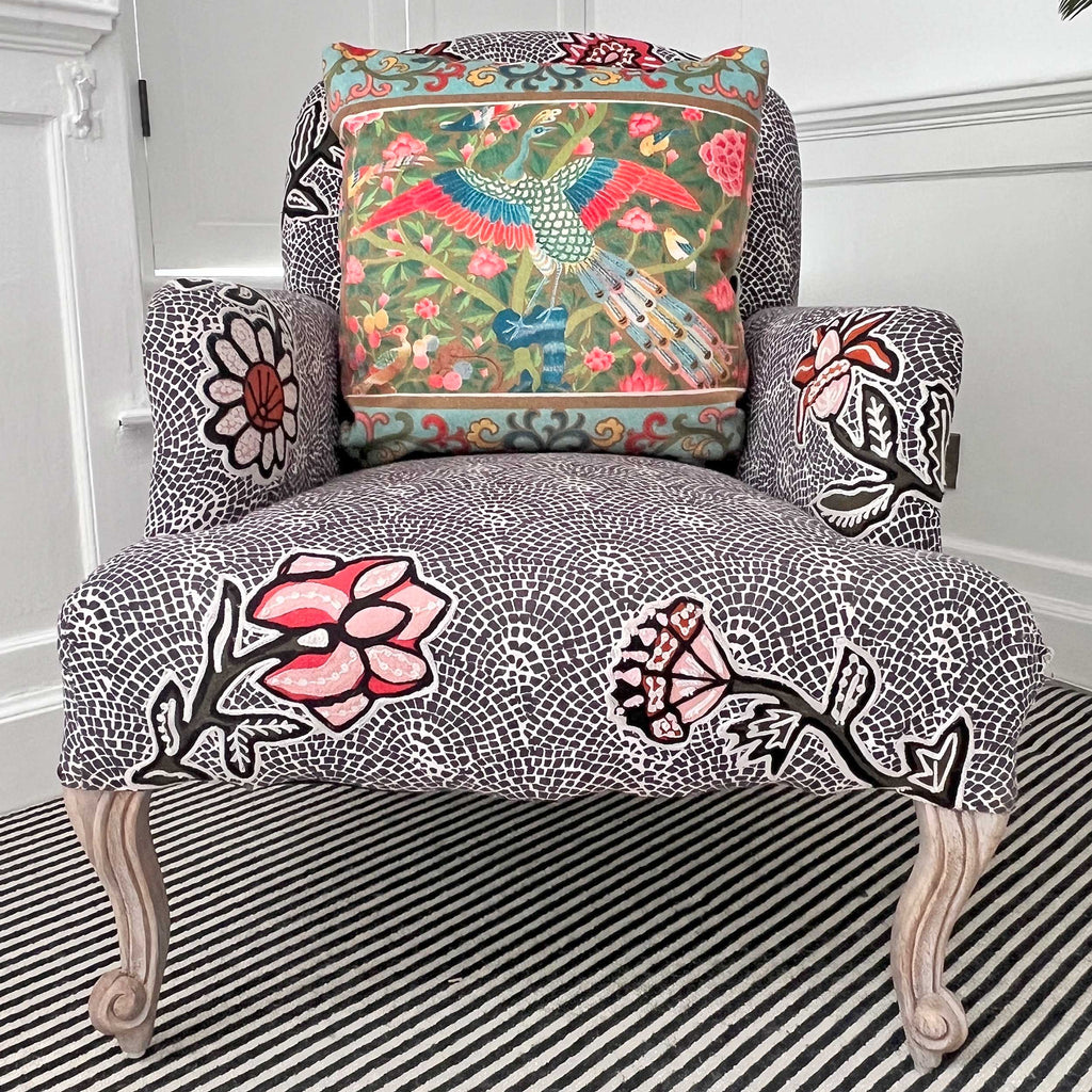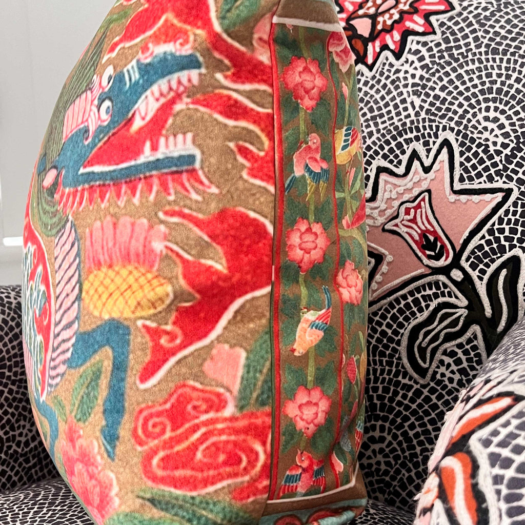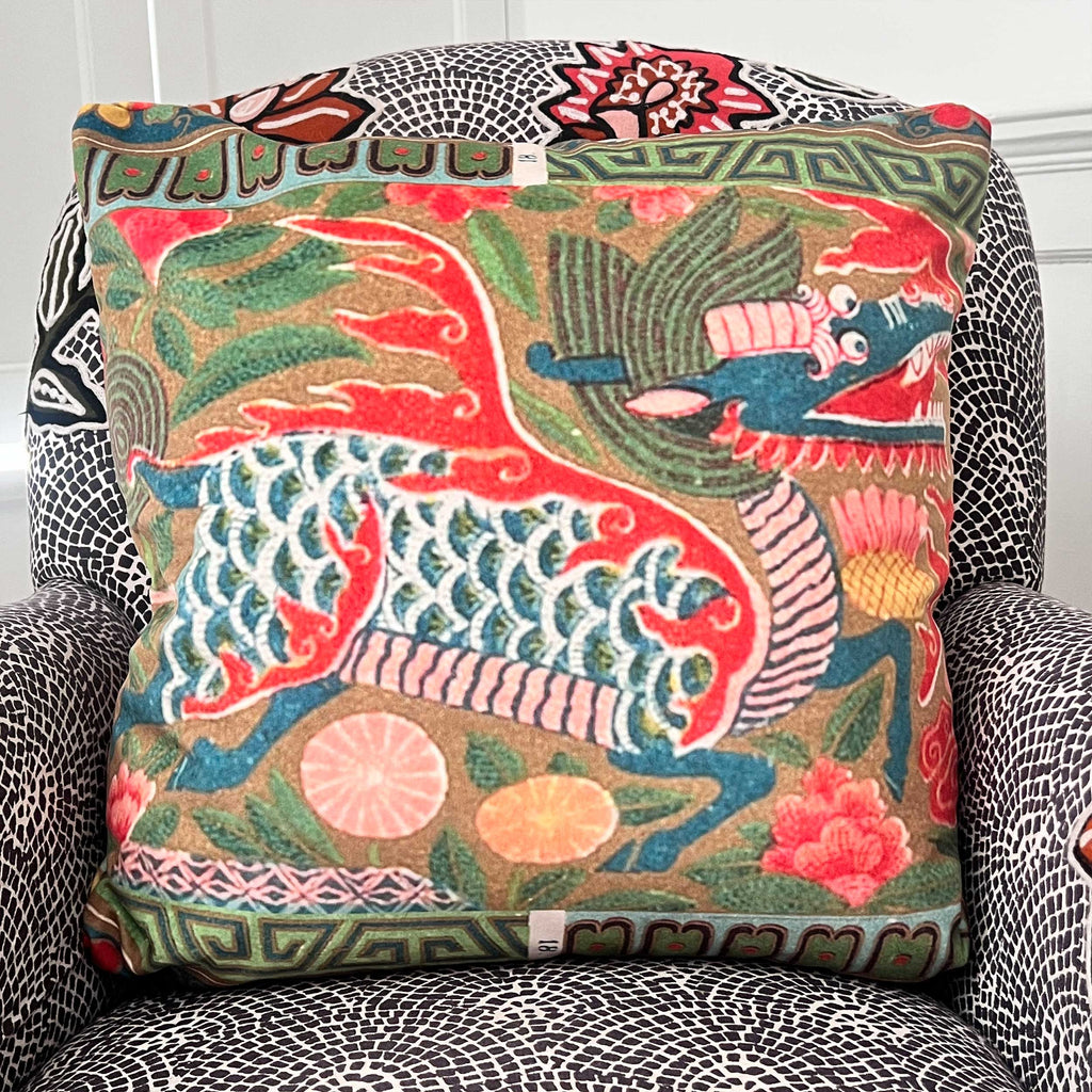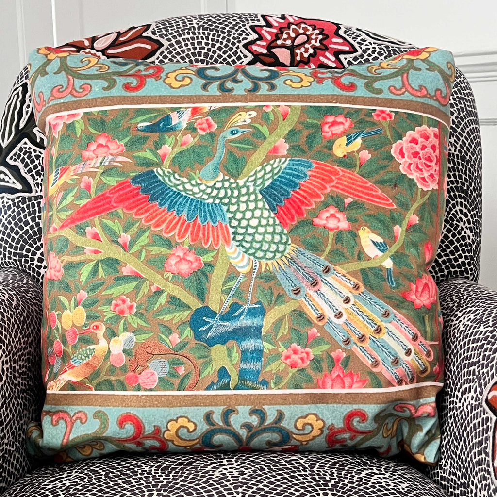I designed the Fire Bird cushion double sided as I couldn't choose which snippets of the original drawing to use. this Firebird cushion is mainly reds and greens and the other one is more blues, it will be up to you to choose which side to put on show.