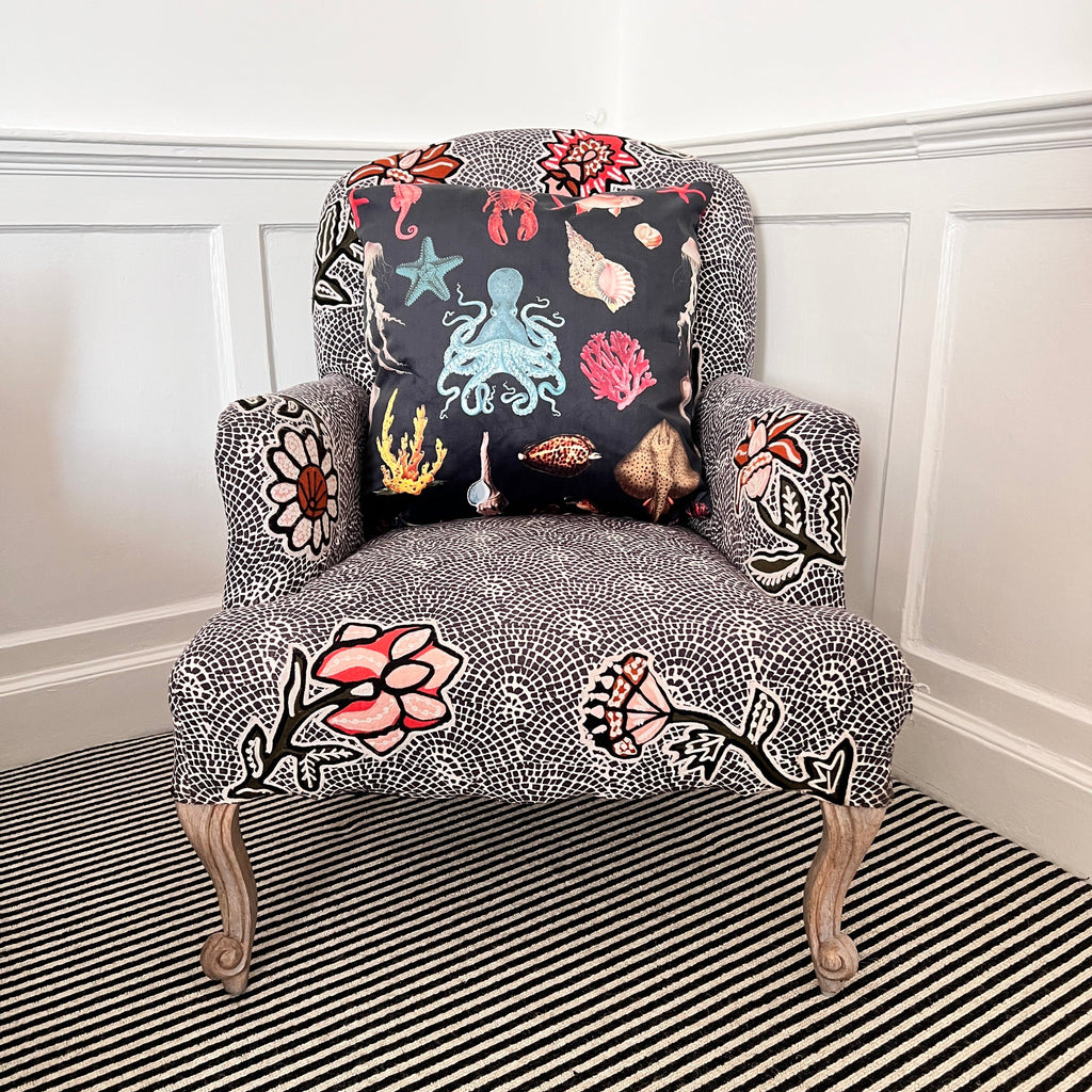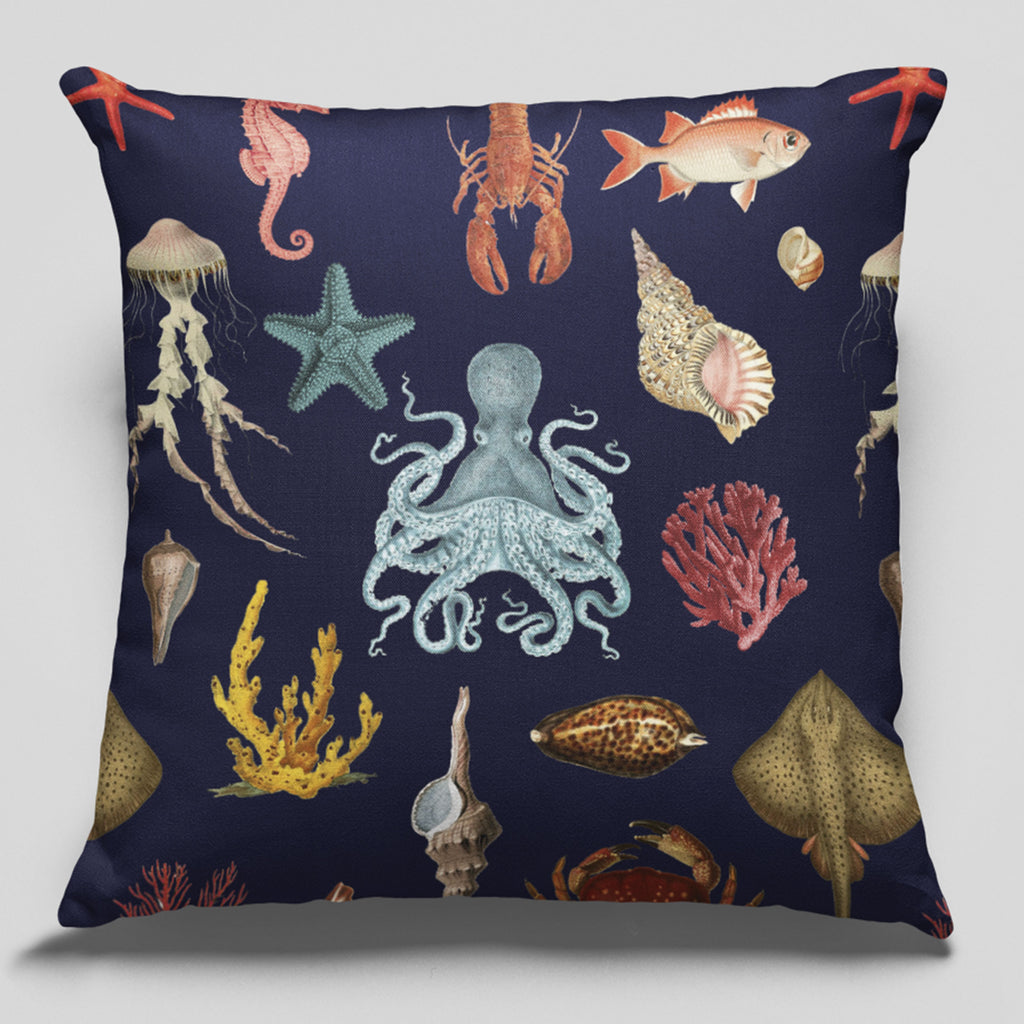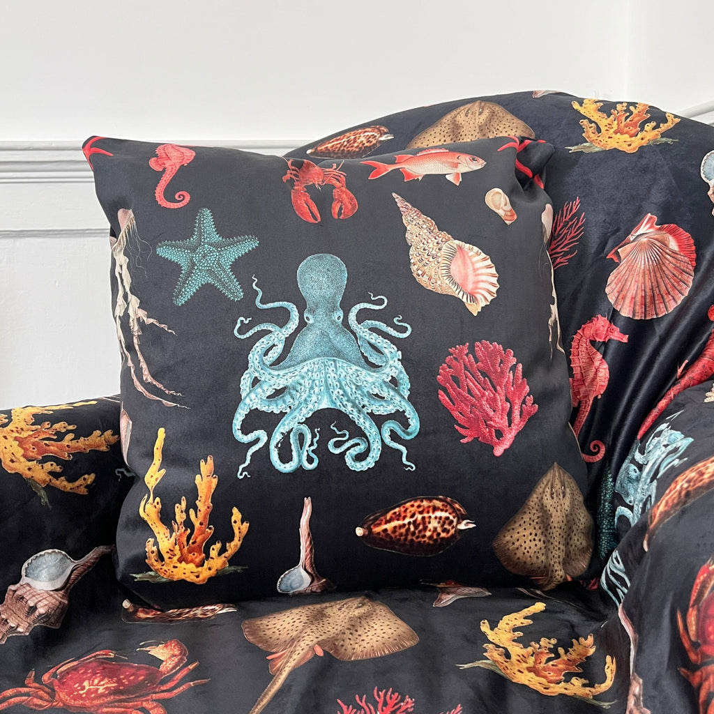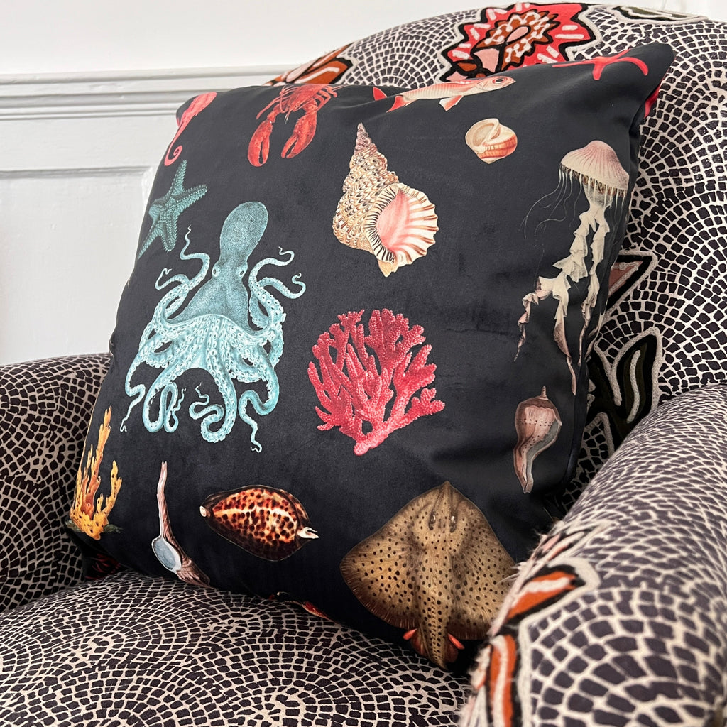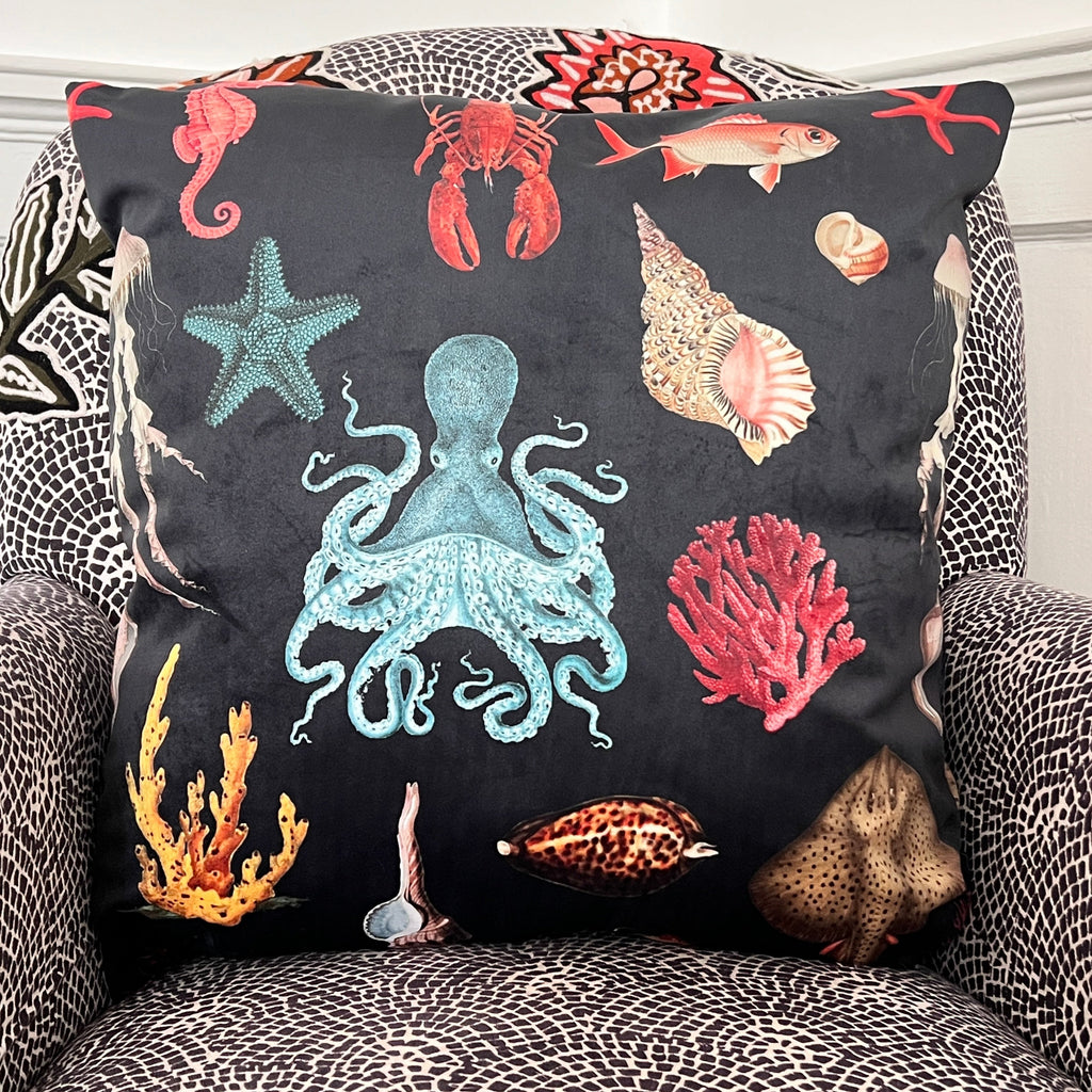 This stylish design cushion will add a splash of colour and mix beautifully with block colour cushions in any area of your home. Rick Navy velvet background with bright colourful Octopus, shells, jellyfish, corals and seahorses.