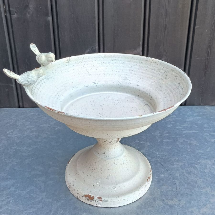 Invite feathered friends to your garden with this charming wrought iron bird bath. Crafted with elegant scrollwork and finished in a soft cream hue, it's the perfect perch for birds to splash and sip. The sturdy iron construction withstands the elements while adding a touch of vintage-inspired character to any outdoor space. Watch as your garden becomes a lively hub of activity—a delightful retreat for both you and your winged visitors.