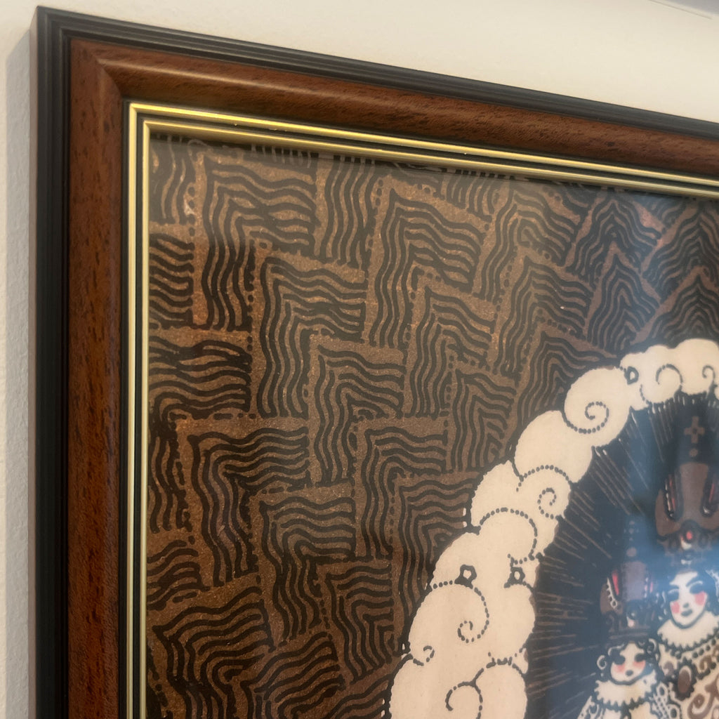 Print size 297mm x 420mm Framed in a dark wood with black edging and Gold trim.