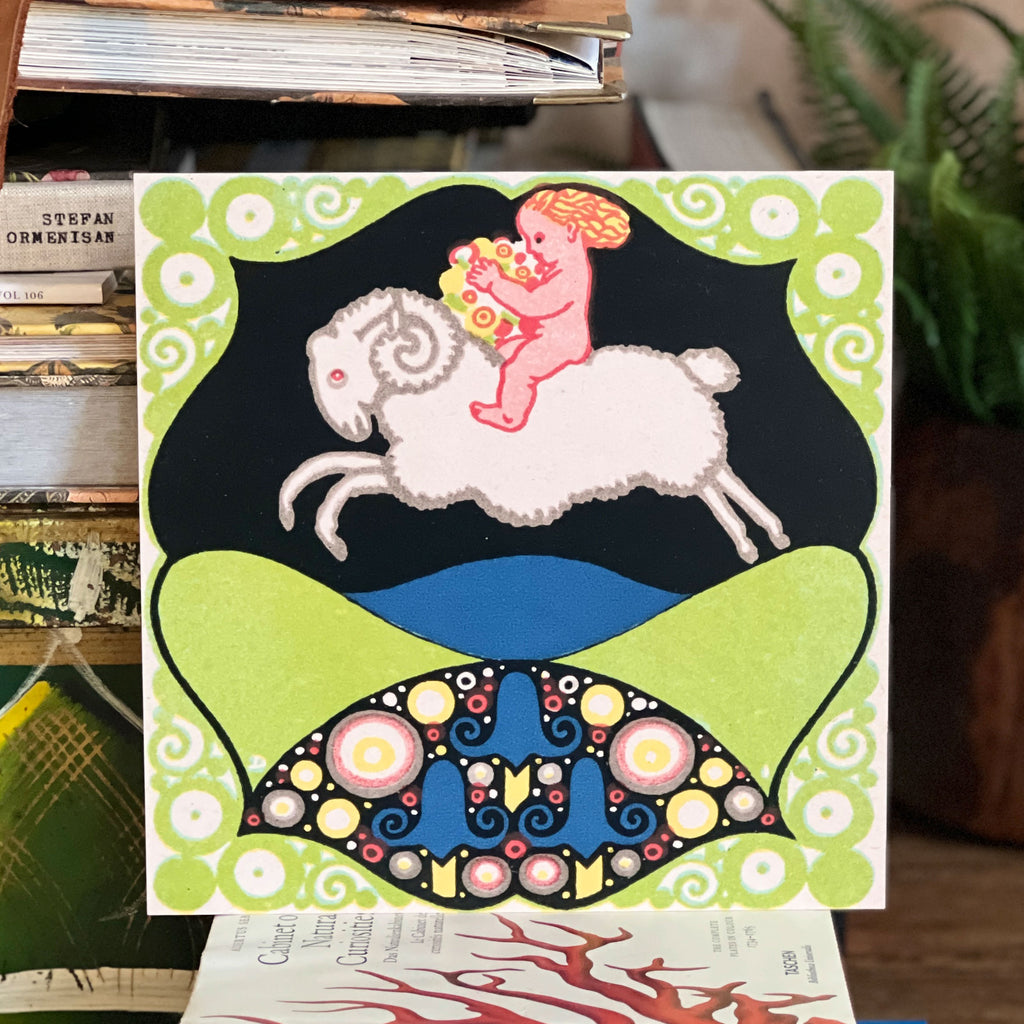 Putto riding a ram 1912 was originally painted by Hungarian artist Josef Von Diveky 1887 to 1951 - Printed on 1mm Satin Aluminium 25cm x 25cm.  We love the smaller prints as they can be placed anywhere or if you prefer wall hanging, fixtures are already in place.